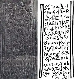 Among the later inscriptions at Philae is the last known inscription in demotic,[10] carved on the roof of the porch of the great temple dedicated to Isis and dated to 11 December 452. This very faint inscription reads "the feet of Panakhetet the lesser", presumably originally having been accompanied by a drawing of feet, commemorating a pilgrimage to the temple.[11] The last known inscription to mention Osiris, written by a pilgrim and not a priest, was written in Greek on 20 December 452 at the entrance of the Abaton by "Smetkhem, son of Pakhoumios". This inscription records that Smetkhem came to the temple with his brother Smeto and "fulfilled his duty", and thanks both Isis and Osiris "for the good". The last known inscription from Philae to mention any pagan religious activity is from the exterior wall of the temple of Isis. Dated to 456/457, the preserved portion of this damaged inscription reads "when Smet was archprophet, Pasnous, son of Pakhumios, was first president of the cult association".[14] Based on the names recorded in the different late inscriptions, it appears that many of the writers were part of the same family;[12][14] it is unclear whether the late worship of the Egyptian deities extended outside of this single family.[14]