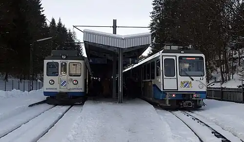 Grainau station (German: Zugspitzbahnhof Grainau) is a railway station on the Bavarian Zugspitze Railway (Bayerische Zugspitzbahn), situated in Grainau, southern Bavaria, Germany, at approximately 750 meters (2,460 feet) above sea level. Positioned between the Obergrainau and Untergrainau districts, near the parish church and Badersee lake, it was originally named Grainau-Badersee. The station serves as the operational hub of the line, marking the transition from the adhesion-based valley section from Garmisch-Partenkirchen to the rack railway section ascending toward the Zugspitze via Eibsee.