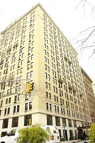 Gramercy Park Hotel was designed by Robert T. Lyons and built by the developer brothers Bing & Bing from 1924–1925, with an official opening in 1925.[1] A westward extension along Gramercy Park North – a continuation of East 21st Street – was designed by the firm of Thompson & Churchill and built in 1929–1930. Both wings were designed in Renaissance Revival style.[2][3] The hotel occupies the site of the former homes of the flamboyant architect Stanford White, political leader and defender of agnosticism Robert Ingersoll and lawyer-diarist George Templeton Strong.[3][4]