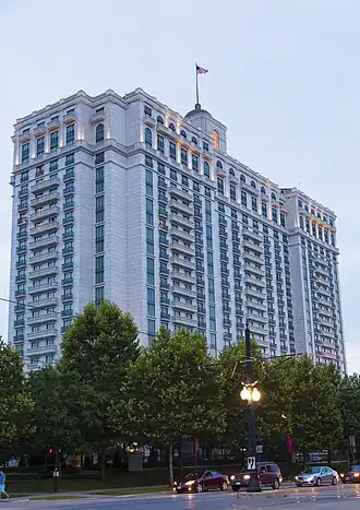 The Grand America Hotel is the largest hotel in Salt Lake City, Utah, United States.[1] Located at 555 South Main Street, Salt Lake City, 84111,[1] it is one block away from Washington Square in the downtown area.[2] It was commissioned and built in 2001 by Earl Holding,[3] and designed by Frank Nicholson.[4] The architect was Smallwood Reynolds Stewart and Stewart. Frank Nicholson was the Interior Designer. The hotel's façade is covered in 300,000 square feet of Vermont white granite. The interior has English all-wool carpets and Milanese and Venetian chandeliers.[5] It was Salt Lake City's only Five Diamond hotel, as ranked by American Automobile Association in 2012.[6]