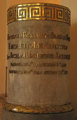 After Okhotnikov's death, the Empress started to shower affection onto her infant daughter, whom she called either "Elise" or "Lisinka". In early 1808, Elizabeth started to show signs of an infection; this infection was blamed on teething. On 12 May [O.S. 30 April] 1808, aged 1 year 5 months, Elizabeth died of this infection.[6] Her mother was inconsolable: she wrote to her mother that "now, [she] is not good for anything in this world, [her] soul has no more strength to recover from this last blow." She also wrote: "I have the illusion of spring in my apartment, the illusion of sunshine, flowers, singing birds, the birds that belong to Lisinka. She was often amused by her bullfinches: One of them whistles perfectly an air which I should never forget if I lived to be a hundred." When a doctor told the Emperor that his wife was still young enough to bear other children, the Emperor responded: "No, my friend, God does not love my children."[6] The infant was buried in Annunciation Church of the Alexander Nevsky Lavra, in Saint Petersburg.[7]