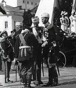 Grand Duke Sergei Alexandrovich started a military career early in his life. He was from birth colonel-in-chief of the 38th Tobolsk Infantry Regiment; he also became colonel-in-chief of the 2nd Battalion Guards Rifles and, towards the end of his life, Colonel-in-Chief of the 5th Kievsky Grenadier Regiment.[9] On his twentieth birthday on 29 April 1877, the Grand Duke took the solemn oath of allegiance to the Emperor.[7] An educational tour that had been proposed for him was postponed upon the outbreak of the Russo-Turkish War of 1877–78. Sergei took part in the war with his father and brothers, the Tsarevich Alexander and Grand Dukes Vladimir and Alexei. He spent the greater part of his time serving as Poruchik in the Leib Guard under the Tsarevich in southeast Romania.[10] He was consequently promoted to colonel. On 12 October, following the battle of Meyk, the Emperor decorated him with the Order of St George, for courage and bravery in action with the enemy, for a reconnaissance expedition at Kara Loma near Koshev. At the end of December 1877, Sergei Alexandrovich returned to Saint Petersburg with his father.