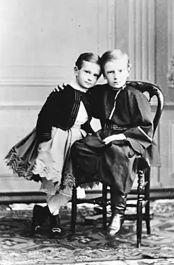 Until he was old enough to begin lessons, Sergei's earlier years were spent with his younger brother Paul, from whom he was inseparable, and their sister at Livadia, the family's Crimean retreat, at Tsarskoye Selo, and at the Winter Palace in Saint Petersburg. By the time Sergei was born, his mother was already in declining health. Although she was not a particularly affectionate mother, except to her daughter, her three youngest children, Marie, Sergei and Paul, were close to her and especially to one another.[3] Marie adored him and called him "an exceptionally nice young man... and can be recommended one very possible way, not because he is my brother, but because he is an exception among princes."[4] As time passed and the Empress's health made it necessary for her to avoid the harsh Russian climate, they spent long sojourns abroad in Jugenheim outside Darmstadt and winters in the South of France.[5] A family tragedy hit them there. In April 1865, shortly before Sergei's eighth birthday, his eldest brother and godfather Nicholas, the heir to the crown, died in Nice.[6] As a child, Sergei was shy, studious, and withdrawn. Under the influence of his mother, whose reserved character he resembled, he became very religious.