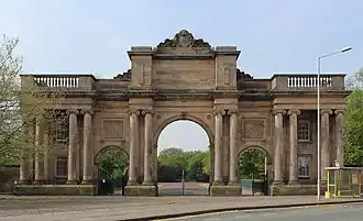 The Grand Entrance to Birkenhead Park is at the northeast entrance to Birkenhead Park in Birkenhead, Wirral, Merseyside, England. It consists of three arches flanked by lodges and is in Ionic style. The entrance was designed by Lewis Hornblower, with amendments by Joseph Paxton, the designer of the park. The park, and its entrance, were opened in 1847. The Grand Entrance is recorded in the National Heritage List for England as a designated Grade II* listed building.