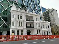 Bankside Cottage, Bankside Street, Central Auckland. Built in the 1880s, the cottage was bought by Hancock & Co. Ltd, brewers, in the mid-1930s. Hancocks were the proprietors of the Grand Hotel next door, facing Princes Street. From the 1930s the cottage was used to accommodate Grand Hotel staff. It was restored when the Grand Hotel was demolished and incorporated into the new development.