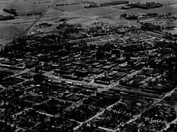 Black-and-white photo: ca. 20 one-story buildings on treeless prairie