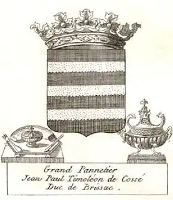 In heraldry, he placed below his shield, left and right, a nef d'or and a cadenas, golden objects placed near the King's setting at the table.