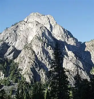 Grand Sentinel is an 8,518-foot-elevation (2,596-meter) pillar located west of the crest of the Sierra Nevada mountain range, in Kings Canyon National Park, in Fresno County of northern California.[3] This landmark is situated at the northern end of the Great Western Divide, two miles west-northwest of The Sphinx, and immediately south of Kanawyers and Zumwalt Meadow. Topographic relief is significant as the north aspect rises nearly 3,500 feet (1,100 meters) above the canyon floor in one-half mile. This feature's name has been officially adopted by the United States Board on Geographic Names.[3]