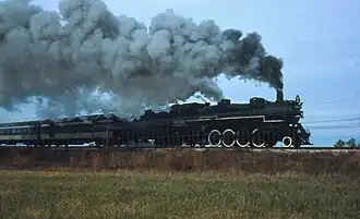 As part of the agreement, Jensen would use No. 4070 to pull two passenger excursions on the GTW mainline.[5][12] On November 3, 1968, No. 4070 operated for the first time in over eight years, and it pulled an excursion between Dearborn Station in Chicago and South Bend, Indiana, commemorating the 50th anniversary of the locomotive's 1918 construction date.[12][14][15] On March 23, 1969, No. 4070 pulled a second GTW excursion between Chicago and South Bend, but the run was plagued with various problems; No. 4070 ran out of water while in motion; it broke down from poor quality coal; when the excursion's conductors and brakemen's legal working limits ran out, the train had to sit at Valparaiso to wait for a new crew to arrive; while waiting at Valparaiso, No. 4070 ran out of steam for its generator, resulting in a power outage in its passenger cars.[5][16][17] No. 4070 and its train had to be towed by a diesel-powered freight train, and it returned to Chicago over nine hours late at 5:00 am the following day.[18][16][17]
