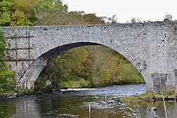 The Old Spey Bridge lies on the south-eastern edge of Grantown, at the locality of Speybridge.[46][47] It dates from 1754, and was built as part of the military road from Grantown eastwards to Corgaff by the 33rd Regiment of Foot under Lord Charles Hay.[46][47] The bridge has three arches. It was damaged by large floods in 1829, leading to the smallest arch being rebuilt.[46][47] By 1931, the old bridge was considered insufficient, and a modern concrete bridge replaced it, upstream to the west. (The current A95 crossing).[46] The new bridge was built by engineers Blyth & Blyth, and consists of a single segmental concrete arch of 240 ft.[48] The old bridge is now used only by pedestrians and cyclists.[46][48]