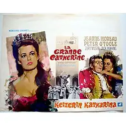 Great Catherine is a 1968 British comedy film directed by Gordon Flemyng and starring Peter O'Toole, Zero Mostel, Jeanne Moreau and Jack Hawkins.[1] It was written by Hugh Leonard based on the 1913 one act play Great Catherine: Whom Glory Still Adores by George Bernard Shaw, loosely based on the story of Sir Charles Hanbury Williams and his time spent as an envoy at the Russian court.