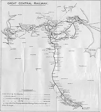 The Great Central Railway in England was formed when the Manchester, Sheffield and Lincolnshire Railway changed its name in 1897, anticipating the opening in 1899 of its London Extension.[2] On 1 January 1923, the company was grouped into the London and North Eastern Railway.