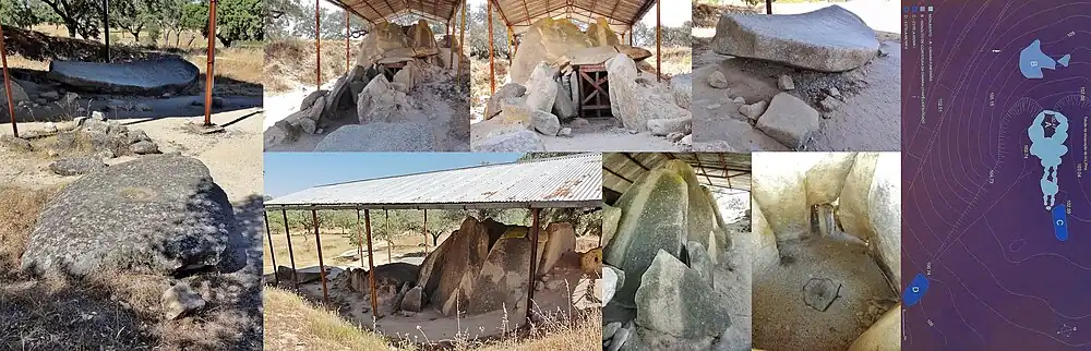 Consists of an irregular free-standing plan, composed of a single-chamber, articulated horizontal body with polygonal chamber and rectangular corridor.[1][2] The funerary chamber and access corridor are covered by size-specific slabs of rock: large granite slabs over the funerary chamber and smaller rock slabs on the entrance corridor.[1][2]