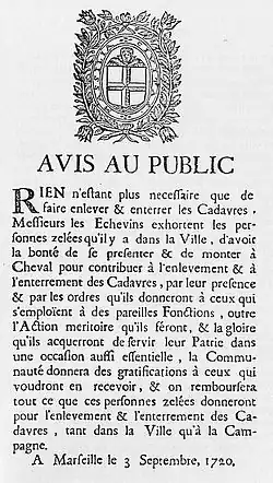 This great outburst of plague was the last recurrence of a pandemic of bubonic plague, following the devastating episodes which began in the early fourteenth century; the first known instance of bubonic plague in Marseille was the arrival of the Black Death in the autumn of 1347.[7] According to contemporary reports, in May 1720,Yersinia pestis arrived at the port of Marseille from the Levant upon the merchant ship Grand-Saint-Antoine. The vessel had departed from Sidon in Lebanon, having previously called at Smyrna, Tripoli, and plague-ridden Cyprus. A Turkish passenger was the first to be infected and soon died, followed by several crew members and the ship's surgeon. The ship was refused entry to the port of Livorno.