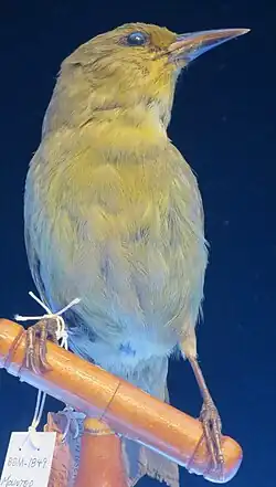 The greater ʻamakihi, also known as the green solitaire while it was extant, was the largest recent ʻamakihi. It was a brownish winged bird with a yellow body ending with a notched tail, and a whitish pointed beak. It was six inches long and it had blackish brown legs. (At least one naturalist of the era, however, noted, "The beautiful blue of the legs is retained in the skin for only a few days and then fades almost to black.")[2]