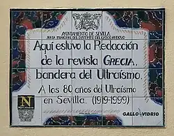 ![]() Commemorative plaque in Seville for the 80th anniversary of the ultraísmo manifesto in Grecia | |