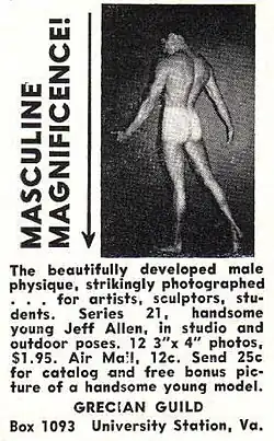 Grecian Guild Pictorial was an American physique magazine published from 1955 until 1968. While ostensibly dedicated to art, health, and exercise, like other physique magazines of the time, it was understood that, in practice, its homoerotic photography and illustrations were almost exclusively created by and for gay men. It differed from other physique magazines in its focus on themes and imagery from Ancient Greece, which was seen by many as a coded reference to homosexuality. It has been described as one of the "gayer" of the physique magazines.[2]