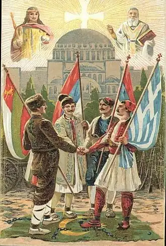 The Balkan Wars must be regarded within the context of the rising Balkan nationalisms during the 19th century, which ran counter to the established Ottoman religion-based millet system. Inspired by the theories of nationalism as expounded in contemporary France, Germany and Italy, Balkan intellectual elites sought to awaken the national consciousness of their compatriots and advocated the creation of ethnically homogeneous nation-states.[1] The first states to be formed out of the Ottoman Empire were Serbia (as an autonomous principality in 1804–1817) and Greece (as a fully independent kingdom in 1821–1832), in both cases following protracted wars. In both cases also, the new states formed only a fraction of the lands claimed as belonging to the respective nations. In the Greek case, fully three quarters of all Greeks still lived under Ottoman rule,[2] and the drive to liberate their "unredeemed" brethren became known as the Megali Idea, first articulated by the Greek Prime Minister Ioannis Kolettis before Parliament in 1844:[3]