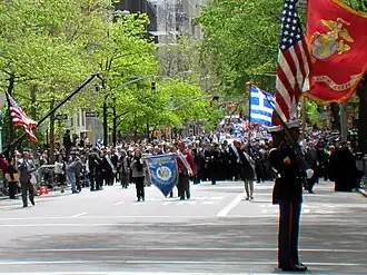 The Greek Independence Day Parade takes place annually in the United States along Fifth Avenue in the Manhattan borough of New York City.[1] The parade is held in annual April in honor of the Anniversary of Greek Declaration of Independence from the Ottoman Empire on March 25, 1821, and the Greek War of Independence.[2] The parade attracts many Greek Americans from the Tri-State area and is the celebration of Greek heritage, Greek culture and Greek achievements in the world.