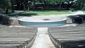 The theatre was built into a hill as a natural amphitheater and used for convocations, rallies, pageants and commencement exercises. In the early 1930s, the area behind the theatre was cleared and gardens were installed. The area was named the "Sunken Gardens" and was landscaped with shrubs and used existing trees for cover. A reflecting pool was also installed. The pool was 150 ft. long, 30 ft. wide and 2 ft. deep with an 8 ft. high statue of Spanish explorer Hernando de Soto located at the far end of the pool.[2]
