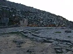 Phase 4 dates to the period of Ptolemaic rule at Cyrene (ca. 320-96 BC).The stage building was demolished and replaced with a larger structure, with short wings at each end. This structure had three doors in the front from which actors could make entrances and exits. The stonework is of a poorer quality than in phase 3. At this time, the cavea was expanded and the brought forward; a large retaining wall was built to support the earth fill under the seating at the eastern edge of the theatre. Above this retaining wall, on the east side of the cavea, a very steep stepped pyramidal monument was built, surmounted by a base which supported a set of four statues (now lost).[3] The inscription on the base (IGCyr 97900) dates to the late fourth or early third century BC and names the honorands as Cleuthemis son of Stasis (who erected the monument while serving as a priest), Cleuthemis son of Philengyus, Damon son of Chartadas, and Stasis son of Cleuthemis.[4][5]