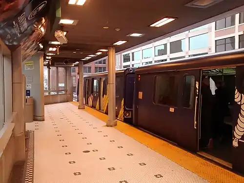 Greektown station is a Detroit People Mover station in downtown Detroit, Michigan. It is located on Beaubien Street at Monroe Street in the Greektown Historic District, for which it is named. The station's lobby is located inside Hollywood Casino at Greektown, connected to the platform structure by a short skybridge. Its exterior features a large neon sculpture designed by Stephen Antonakos.[1][2][3]