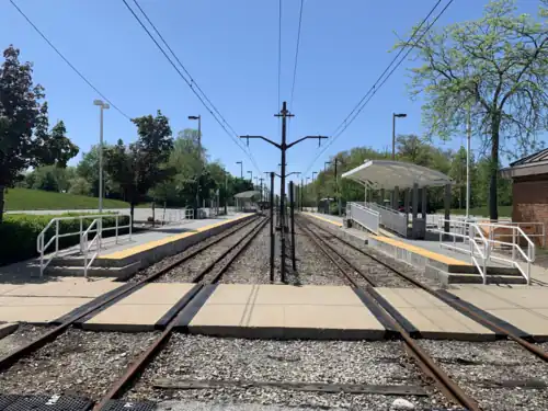 Green Road station is the eastern terminus of the Green Line on the RTA Rapid Transit in Shaker Heights, Ohio. It is located in the median of Shaker Boulevard (Ohio State Route 87) at its intersection with Green Road, from which the station takes its name.