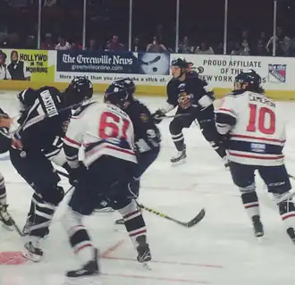 Greenville Swamp Rabbits (in navy) vs. South Carolina Stingrays in February 2016.
