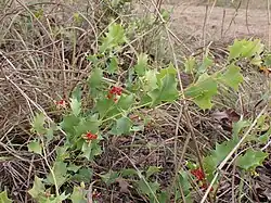 Grevillea longicuspis is a shrub that typically grows to a height of 0.6–1 m (2 ft 0 in – 3 ft 3 in), its branchlets and leaves partly covered with glandular hairs. Its leaves are egg-shaped in outline, 25–80 mm (0.98–3.15 in) long and 120–60 mm (4.7–2.4 in) wide on a petiole 5–14 mm (0.20–0.55 in) long, and are usually divided with four to eight sharply-pointed triangular teeth or lobes. The flowers are arranged in more or less spherical to oval clusters on the ends of branches or in upper leaf axils on a rachis 3–18 mm (0.12–0.71 in) long, each flower on a pedicel 2.0–3.5 mm (0.079–0.138 in) long. The flowers are red and glabrous, the style red to pinkish- or lemony-cream, the pistil 6.5–9.5 mm (0.26–0.37 in) long. Flowering occurs from August to December and the fruit is a glabrous, oblong follicle 9.5–12.5 mm (0.37–0.49 in) long.[2][3]