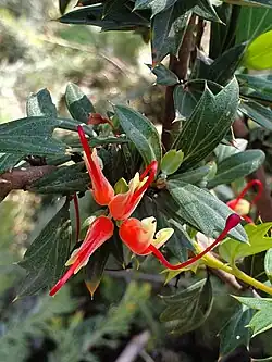 • Grevillea tripartita Meisn. subsp. tripartita is a more or less erect shrub with deeply divided, spreading, linear lobes, the flowers orange-red and yellow flowers in most months, with a peak from August to November.[10][11]