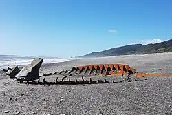 On 23 June 1910 the Lauderdale was heading to Greymouth from Nydia Bay and on 27 June struck the north tiphead, ending up stranded on the Blaketown beach after, at one point, being grounded against another shipwreck from 1908, the Hawea.[34][35] The Lauderdale is one of three wrecks which remain on the Greymouth coastline in the twenty-first century and in April 2016 a local Blaketown family unveiled a commemorative plaque on the West Coast Cycle Trail, telling its story. This plaque is within sight of the wreck remains which appear and disappear on the shoreline with the tides.[36] The Abel Tasman and the Hawea are the other two remaining wrecks.[36]