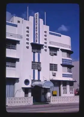 In the 1979 nomination of that district, the Greystone was characterised as being Decorative Moderne in style.[2] The nomination noted that "the Greystone Hotel is in beautiful condition. On the west side of Collins Avenue, it is most noticeable, located on the corner of 19th Street. The main entrance features a pair of round windows etched with tropical scenes. The almost square facade is divided into thirds, with the central section ornamented with vertical stripes and a stepped, three-stage parapet. The horizontal flanking portions of the facade are decorated with bands of 'tattersall check' between the ribbon windows at the curved corners. It is the detail of this building, the round windows, the flagstaffs on the parapet, and the incised squares in the stucco, that make this building so charming."[2]