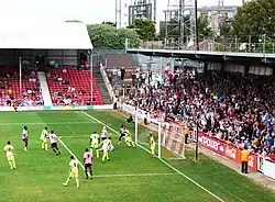 - Braemar Road Stand – A two-tiered all-seated stand located along the Braemar Road,[49] with the lower tier being known as 'the Paddock'.[50] The stand also housed the dressing rooms, supporters' bar and club offices.[51] The stand's forecourt housed the club shop and ticket office.[52] Until 2010, the dugouts were located in front of the stand.[53]