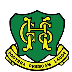 The school was opened in 1933 as "Griffith Intermediate High School" at the cost of A£15,000, with the foundation of the main building laid by the Minister for Education, David Drummond, on 8 March 1933.[1][2] The school was upgraded to a fully comprehensive high school in July 1939.[3] The school's badge consists of a green shield with the school's abbreviation "GHS" inside in gold, set above a gold scroll containing the motto. The motto, Postera crescam laude ("Later I shall grow by praise" or, more freely, "We shall grow in the esteem of future generations") is from a line in Horace's Odes: "ego postera crescam laude recens". It is also the motto of the University of Melbourne.