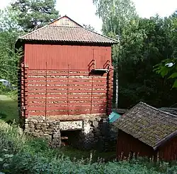 The Trehörnings blast furnace in Mariedamm was originally built by local miners in 1636. Louis De Geer bought it in 1648, and it became part of the Godegårds ironworks which was sold on to Jean Abraham in 1775. The blast furnace remained a part of the Grill's estate at Godegård until 1888 when it was sold to the Skyllbergs bruk. The blast furnace was in operation until 1889. Since 1923, it is in being cared for and renovated by the Lerbäck Heritage society.[114] At the beginning of the 19th century, a mansion was built in Mariedamm by the Grill family. The mansion was demolished in the 1920s, only one of the wings remain.[115]