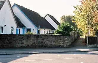 The Plough, opposite the station site, which acted as ticket office before the station was built. The footpath to the left, between two fences, follows the course of the dismantled line.