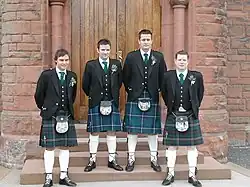Bridegroom-men formerly had important duties. The men were called bride-knights, and represented a survival of the primitive days of marriage by capture, when a man called his friends in to assist to "lift" or kidnap the bride, or from the need to defend the bride from would-be kidnappers.[3][4][5]
