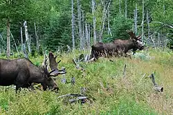 The most notable animal in the park is the moose, part of a booming population that was introduced to Newfoundland around 1900. Other common wildlife in the park include red foxes and Arctic foxes, an ecotype of caribou (R.t caribou), black bears, snowshoe hares, red squirrels, lynxes, river otters and beavers. Harbour seals are common in St. Pauls inlet; further, cetaceans (minkes, humpbacks, fins, pilots, orcas, atlantic white-sided dolphins, harbour porpoises)[10] may be in the area, especially during the capelin season in early summer. Many bird species can be found in the park, from shorebirds along the ocean to birds of the bogs and interior forests.[11]