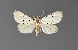 The noctuid species, G. septempunctata, has a pure white head and thorax with an abdomen brown, tinged with a yellowish white. The palpi and frons are black brown and the antennae are yellow. Tibiae and tarsi banded with black; forewing almost pure white; the costal edge black towards base; subbasal black points below costa and cell; small antemedial black spots on costa, in submedian fold, and on inner margin, the spot in the fold slightly nearer the base; small postmedial black spots on costa, discocellulars, in submedian fold and on inner margin. Hindwing white, the apical area to the discocellulars and vein 3 tinged with fuscous brown. Underside of forewing, except the inner area and cilia, and the costal area of hindwing fuscous brown.[2]