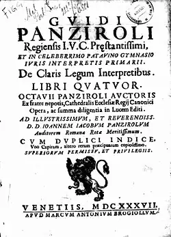 Guido Panciroli or Pancirolli[a] (17 April 1523 – 5 March 1599) was a sixteenth-century Italian antiquarian, historian, jurist and law professor at Ferrara, Padua and Turin.[2] In his time he was renowned as a legal scholar, teaching students who came from all around Europe.[3] Posthumously, he was well known for his innovative comparative survey, Rerum memorabilium, iam olim deperditarum, that brought attention to the loss of knowledge since the ancient world.[4][5]