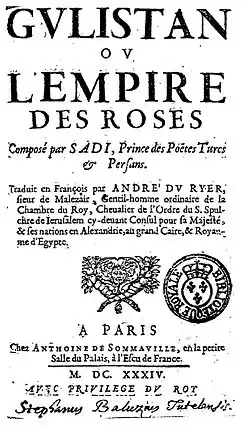 - ^ texte, Saʿadī (1193-1292?) Auteur du (1634). Gulistan, ou L'empire des roses, composé par Sadi,... trad. en français par André Du Ryer,...