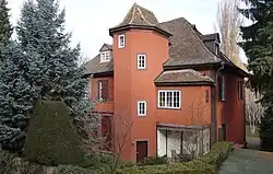 The Front or Inner Castle (Vorderes oder Inneres Gundeldingen) was built during the 16th century as a manor house for a wealthy merchant. Over the following centuries it was owned by a number of wealthy families. Currently it is owned by the Canpasoglou de Fürstenberg family. The manor was the center of a large country estate and for over two centuries was surrounded by a large garden and duck pond. The main building was first painted red about 250 years ago, beginning a tradition that lasts until today. Only the main building remains at Dittingerstrasse 20.[2]