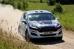 Greensmith driving a Ford Fiesta R2T at 2015 Rally Poland