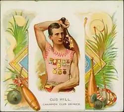 Gus Hill was born Gustave Metz in New York City on 22 February 1858. His parents, Gustave Metz and Martha E. Baecht Metz, were German immigrants. Gus was the oldest of three surviving boys.[1] His father was the owner of a sawmill and furniture factory.[2] Gus Hill was an amateur athlete. He became a wrestler and then a juggler with Indian clubs.[3] He took the name "Hill" from a sporting resort at Broadway and Crosby Street in Manhattan called Harry Hill's.[4][a]
