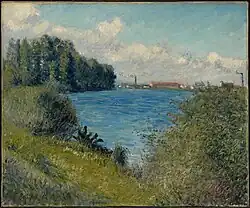 While Caillebotte was known for his urban and domestic scenes, he also painted many rural scenes of the area around his home in the years before his death.[28] His work had shifted to en plein air works of landscape painting, especially river scenes.[10]
