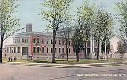 Around 1909, George H. Wiltsie sold his five-acre property at 134 Homer Avenue to the hospital association for $18,000 and Chester F. Wickwire initially donated $70,000 to construct a "first-rate" facility. The property housed the Copeland-Fitz Boynton residence which was attached to the rear of the new building. This Cortland Hospital opened in 1911 with an entrance modeled on that of the White House. By 1911, Wickwire had donated a total of $95,000.[3][6] The new hospital had 52 beds total with separate wards for men and women, 22 private rooms, a children's ward, and two operating rooms.[3]