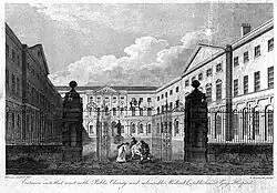 The Colonnade is also part of the original Guy's Hospital. It was built with two courtyards on either side.[2] A round-hooded Portland stone alcove with a figure sitting inside is located at the eastern courtyard of the Colonnade. The alcove was originally part of, and is one of the surviving fragments of the old London Bridge that was demolished in 1831.[2][3] The alcove was brought to the hospital in 1861, and was re-erected within the eastern internal court in 1926.[3] The alcove now houses the statue of John Keats, an English Romantic poet who studied at Guy's Hospital from 1815 to 1816 to become an apothecary. The statue displayed at the western courtyard on the other side of the Colonnade is that of William Morris, 1st Viscount Nuffield, another benefactor of Guy's Hospital.[2] The front courtyard, named the General Court, was later built in 1738,[3] and the part of the Georgian complex was completed in 1780.[5] A brass statue of Thomas Guy by Peter Scheemakers stands in the centre of the General Court,[2][6] upon a pedestal with bas-reliefs of "Christ Healing the Sick" and the "Good Samaritan".[4][6]