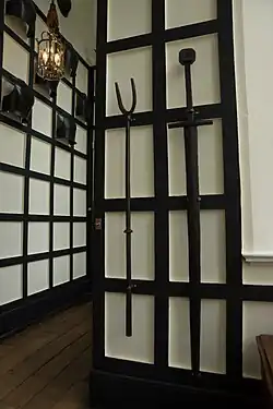 Guy was transformed in the fourteenth century with a spate of metrical romances written in Middle English. The versions which we possess are adaptations from the French, and are cast in the form of a roman; the adventures open with a long recital of Guy's wars in Lombardy, Germany and Constantinople, embellished with fights with dragons and surprising feats of arms.[4] The name Guy entered the Beauchamp family, earls of Warwick, when William de Beauchamp IV inherited the title in 1269 through his mother's brother, and named his heir "Guy" in 1298. A tower added to Warwick Castle in 1394 was named "Guy's Tower", and Guy of Warwick relics began to accumulate,[7] including the reputed Guy of Warwick's Sword, Sir Guy's fork (believed to be a historic military fork), and large cauldron known as Sir Guy's "Porridge Pot" (believed to be a large garrison crock of the sixteenth century).[8] Queen Elizabeth I is alleged to have paid for these relics to be guarded.[9]