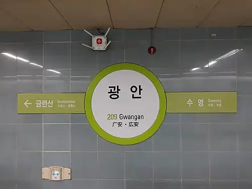 Gwangan Station (Korean광안역) is a station on the Busan Metro Line 2 in Gwangan-dong, Suyeong District, Busan, South Korea.