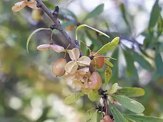 Edwin Percy Phillips, the South African taxonomist, describes the genus Gymnosporia in his 1926 "Genera of South African Plants" as Sepals 5, sometimes unequal, acute, obtuse, sometimes acuminate, with entire, deeply laciniated or fimbriated margins. Petals oblong to sub-orbicular, with the margins entire ciliated or undulate. Disc deeply 5-lobed, sometimes 5-sided, collar-like or saucer-shaped, with crenate or undulate margins. Ovary 2-4-chambered, with 2 ovules in each chamber; style usually short; stigma 2-4-lobed. Fruit a capsule. Seeds often with an aril.